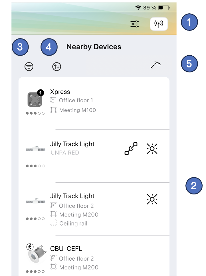 When the list is opened, Casambi Pro scans the nearby environment, and then lists all detected Casambi enabled devices in the view. The list can be updated by dragging it down with finger.