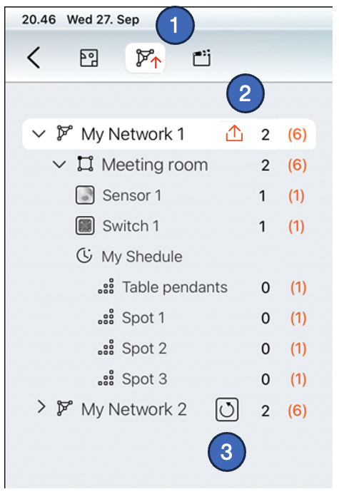 In the Network list, there is a red or grey arrow icon next to the network name if there are some pending changes that have not yet been uploaded to this network. When you are within Bluetooth range of a network and want to upload new configurations to it, tap the red arrow next to the network name to upload the latest configuration to the network.