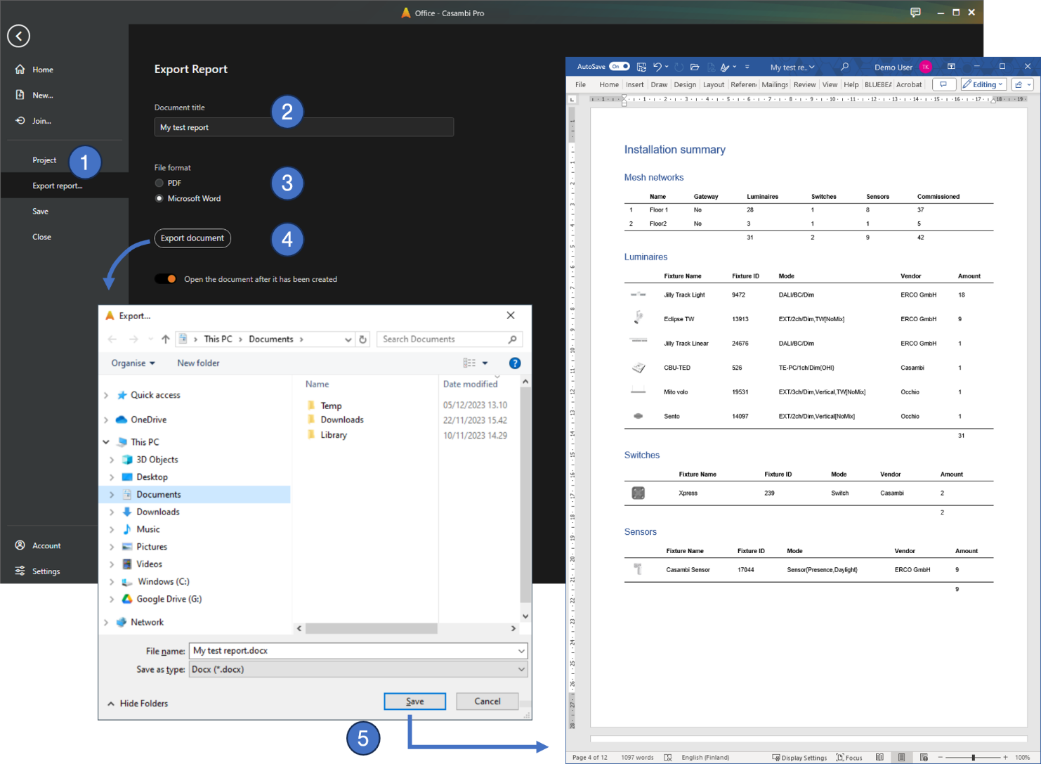In Casambi Pro for Windows, it is possible to export summary of the project’s networks, their elements and configurations to a PDF or DOCX (MS Word) document formats.