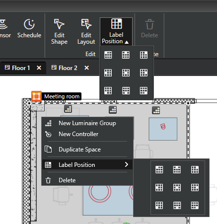By default, space and group labels are positioned at top left corner of the area.