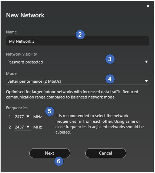 1. Select mode for the network. The network mode and network frequencies can only be configured when creating a network for the first time and cannot be changed after a network has been taken into use.